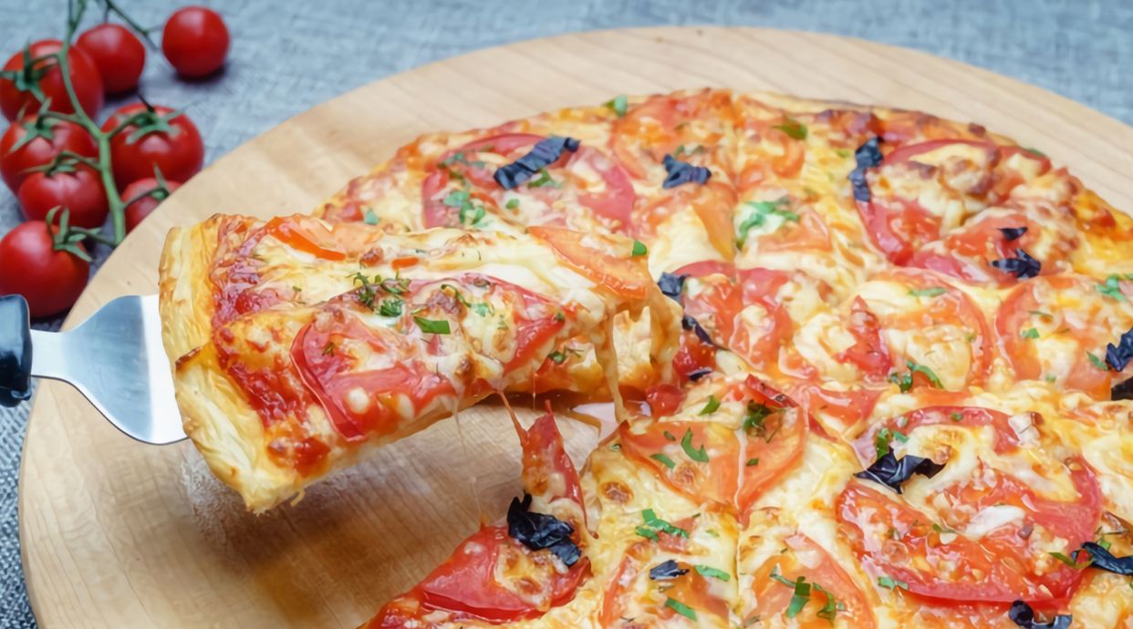 Tomate, mozzarella, bacon, cebolla morada y champiñones