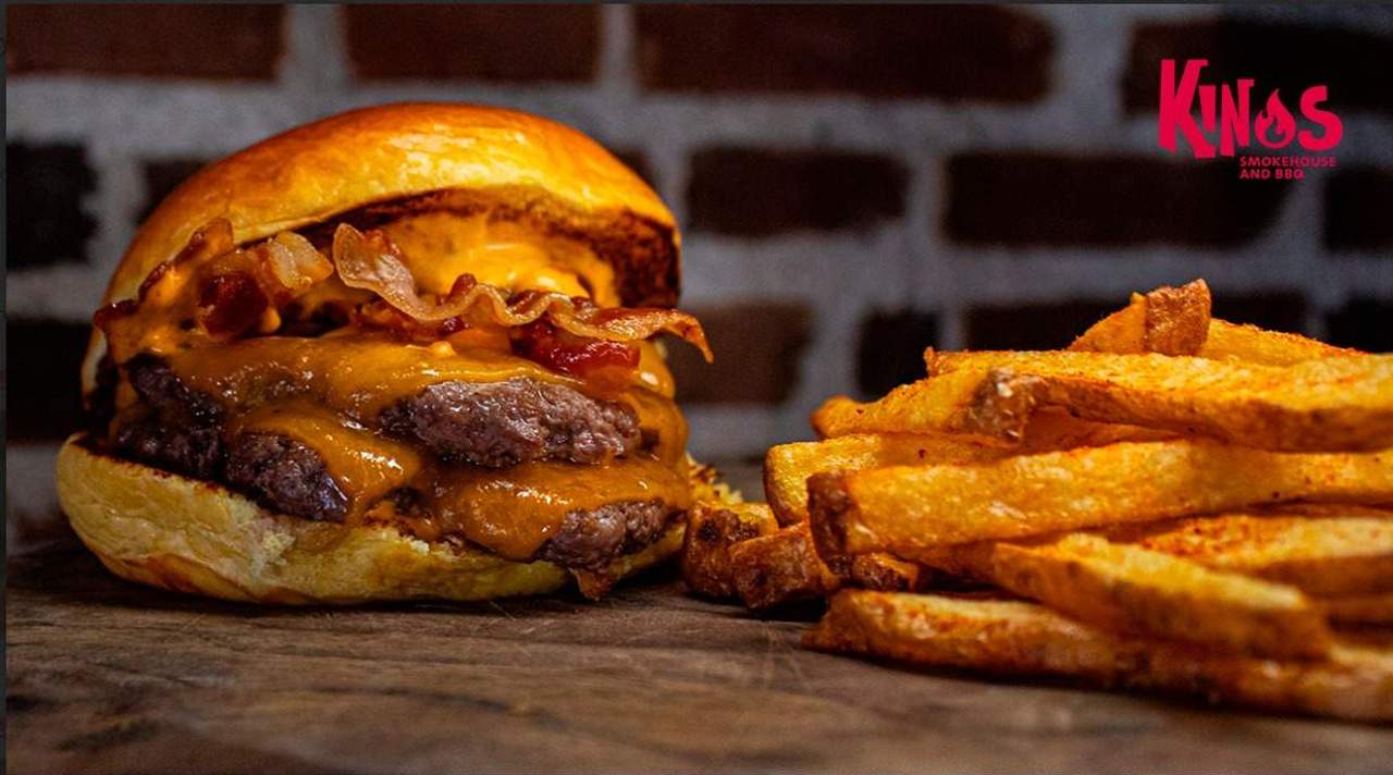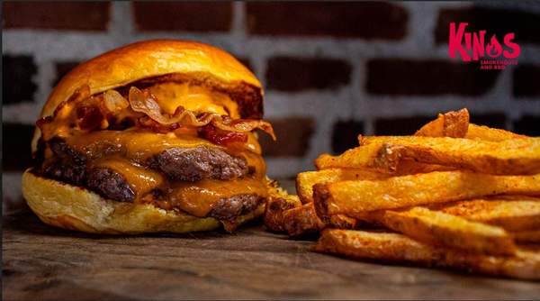 Hamburguesa en pan brioche elaborada con vaca Premium, queso cheddar, panceta ahumada y salsa Kinos. Acompañada con patatas fritas.