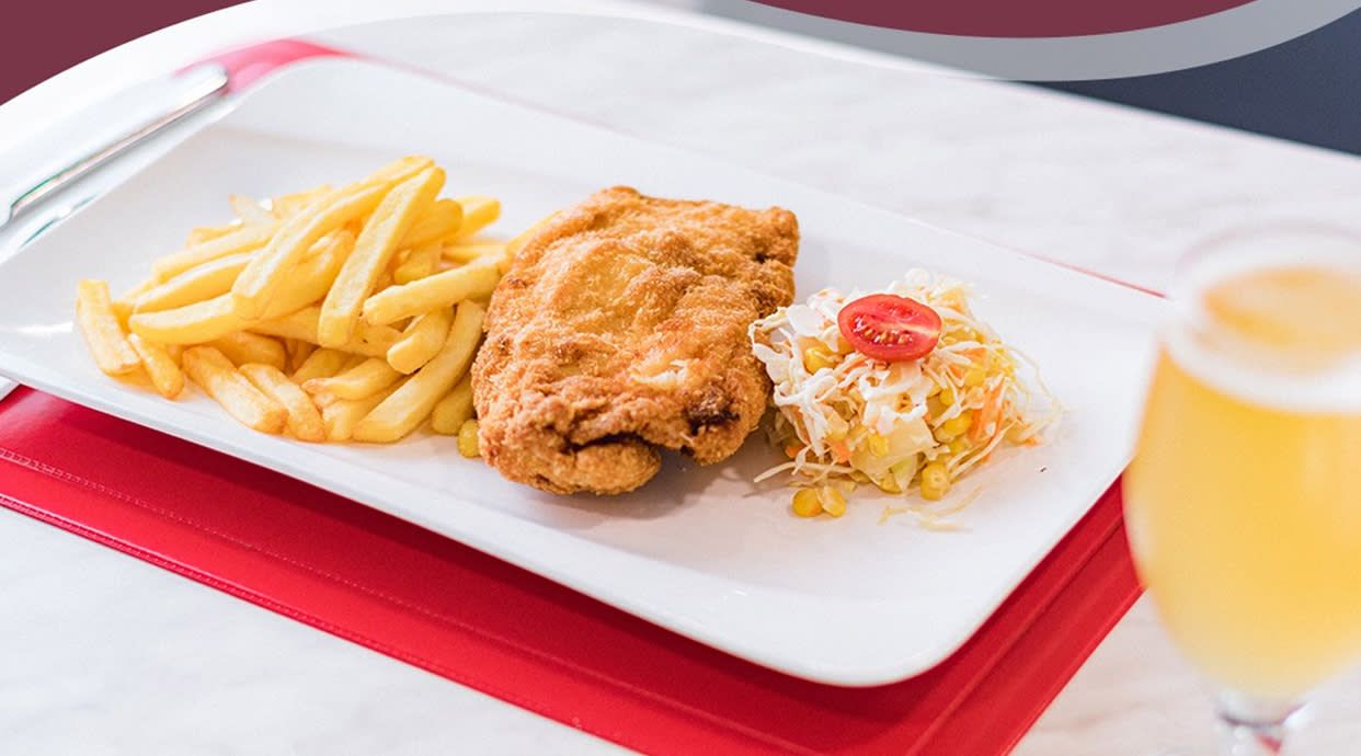 Filete de pechuga empanada muy crujiente, guarnición de fritas y ensalada de col