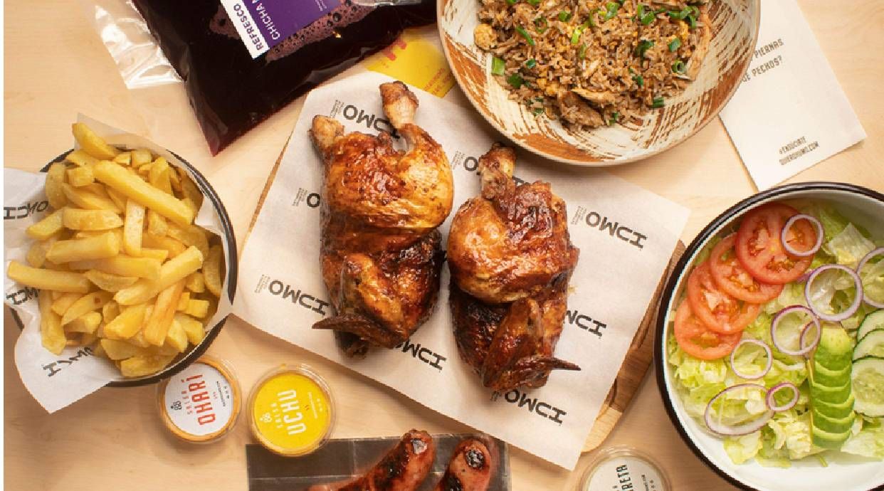 1 Pollo Asado a las Brasas Entero / Papas Fritas / 2 Chorizos / Ensalada / Vinagreta Salsas: Uchu y Qhari + Refresco Maracuyá 1L