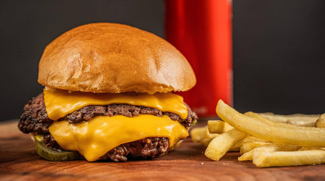 Hamburguesa de carne con queso derretido y papas fritas