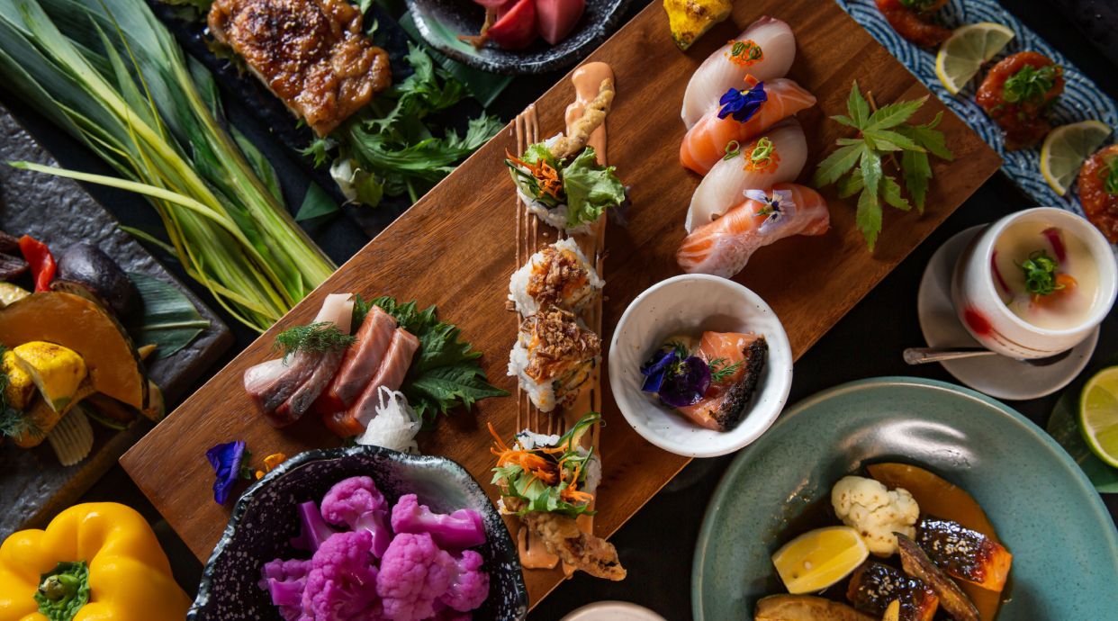 8 Maki salmón, 8 maki atún rojo, 4 nigiri salmón, 4 nigiri atún rojo, 6 lechuga roll, 6 crispy roll surimi, 8 uramaki salmón y queso, 2 hiyashi roll surimi y 8 dragón roll salmón
