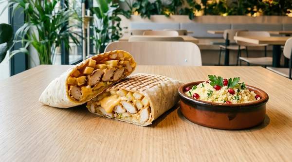 Sándwich de pollo a la parrilla, servido en pan pita con vegetales