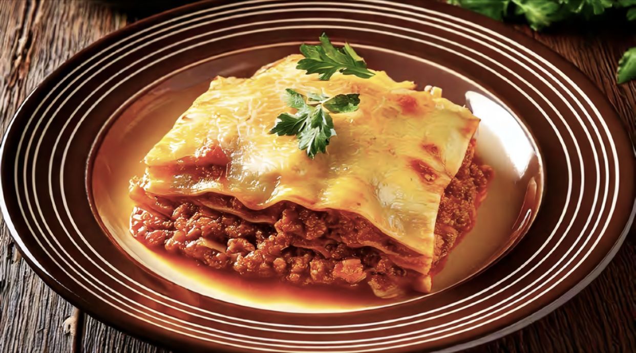 Lasaña reconfortante de ternera deshilachada a mano, con capas de pasta de huevo, salsa de tomate y queso grana padano