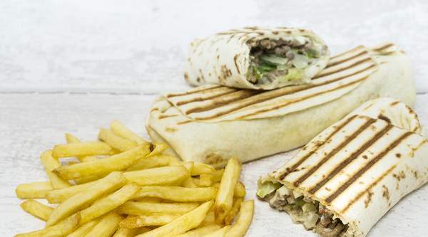 Kebab de ternera, salsa de queso, patatas naturales y mozzarella