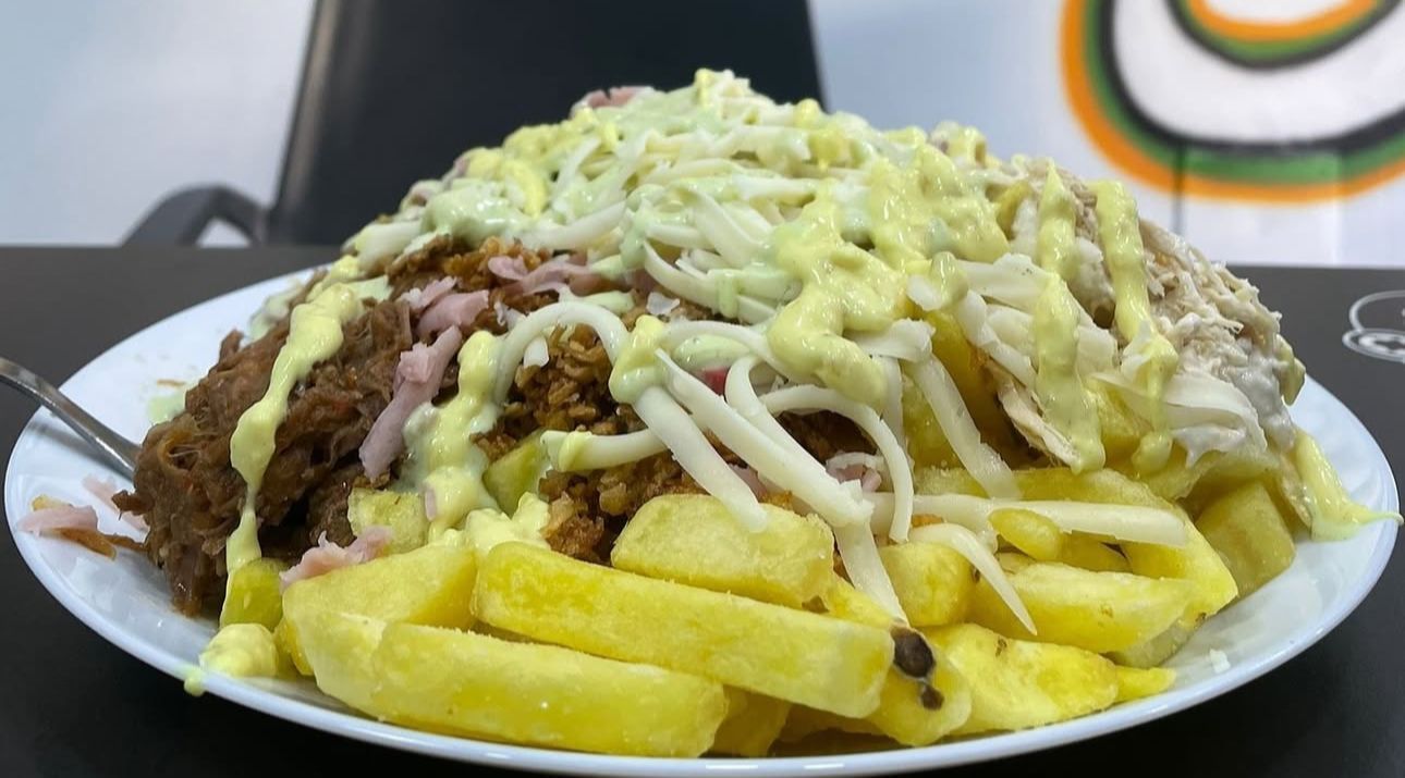 Papas, jamón, cebolla frita, queso, salsa kétchup, mayonesa y mostaza