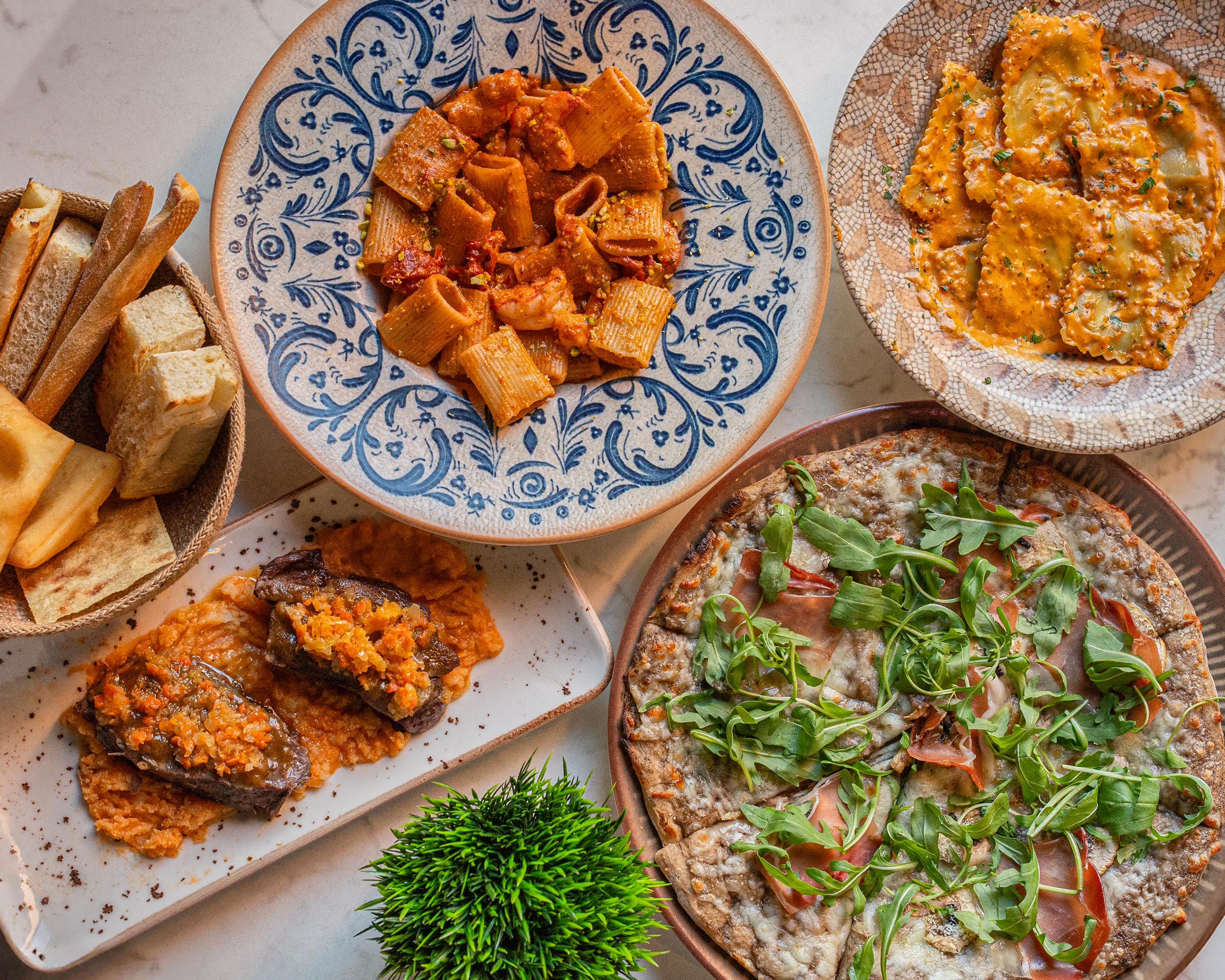 Rellenos de rabo cocinado a fuego lento con vino tinto Barolo,nuestra salsa especial de pesto rojo y almendra chili-limón