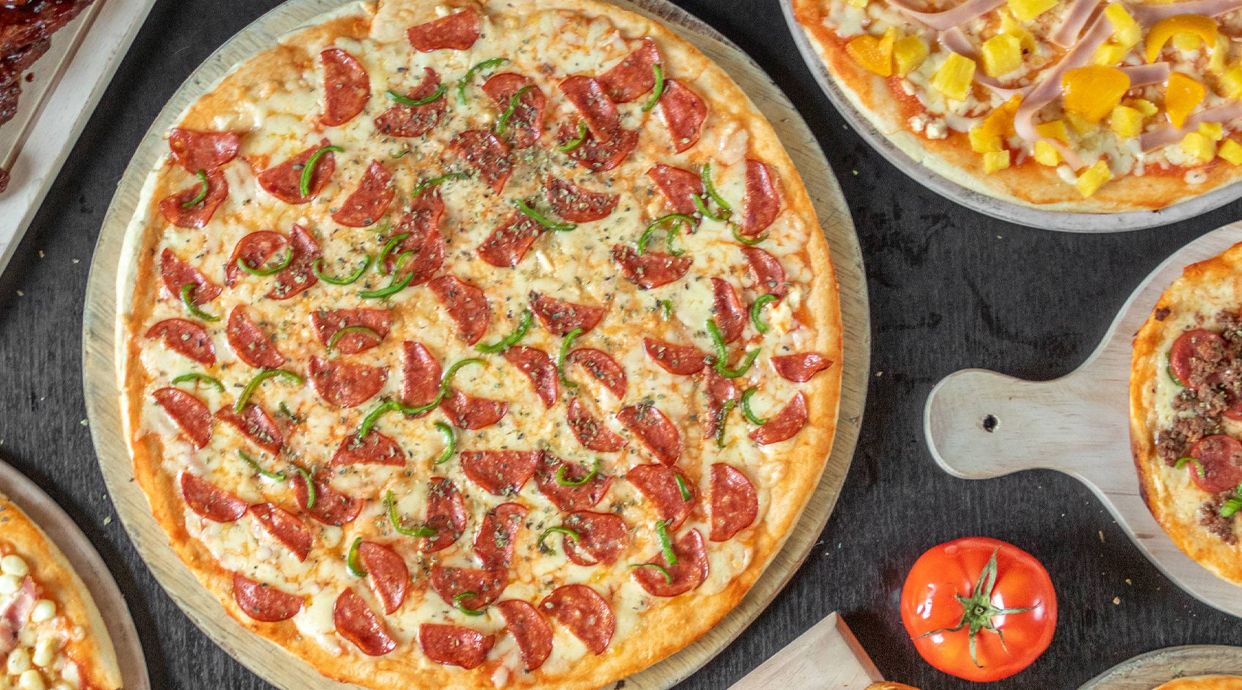 Masa, tomate, queso mozzarella, queso gouda, York y orégano