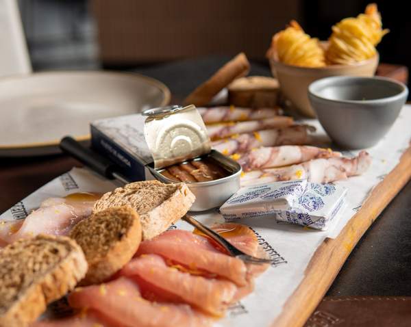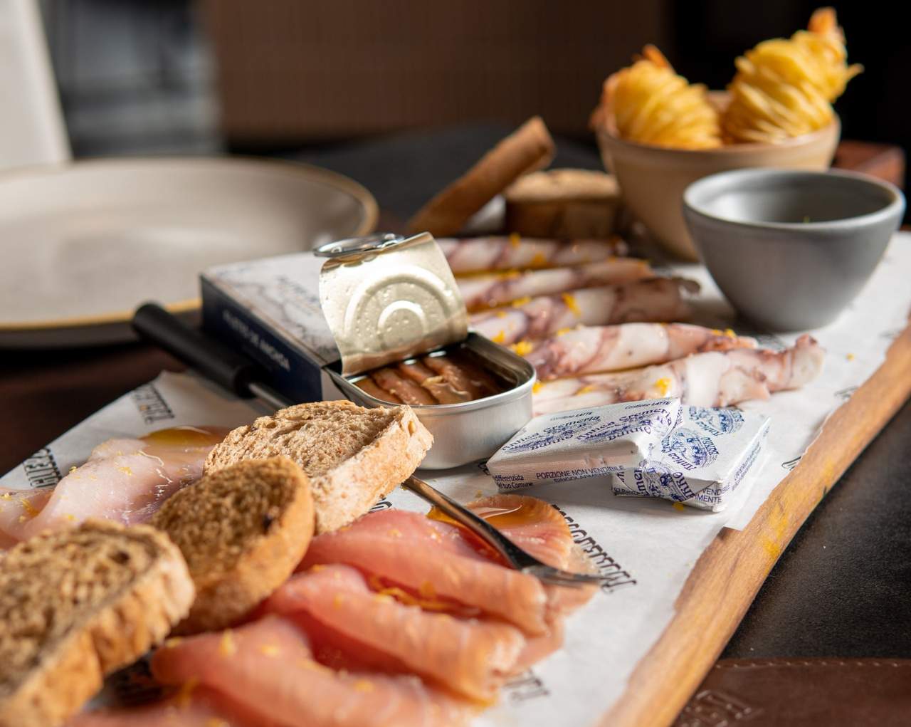 Carpacci di tonno e spada affumicati, Tartare di Salmone tagliata al coltello, vinaigrette al passion fruit e avocado,crostini con Alici del Cantabrico e burro salato.