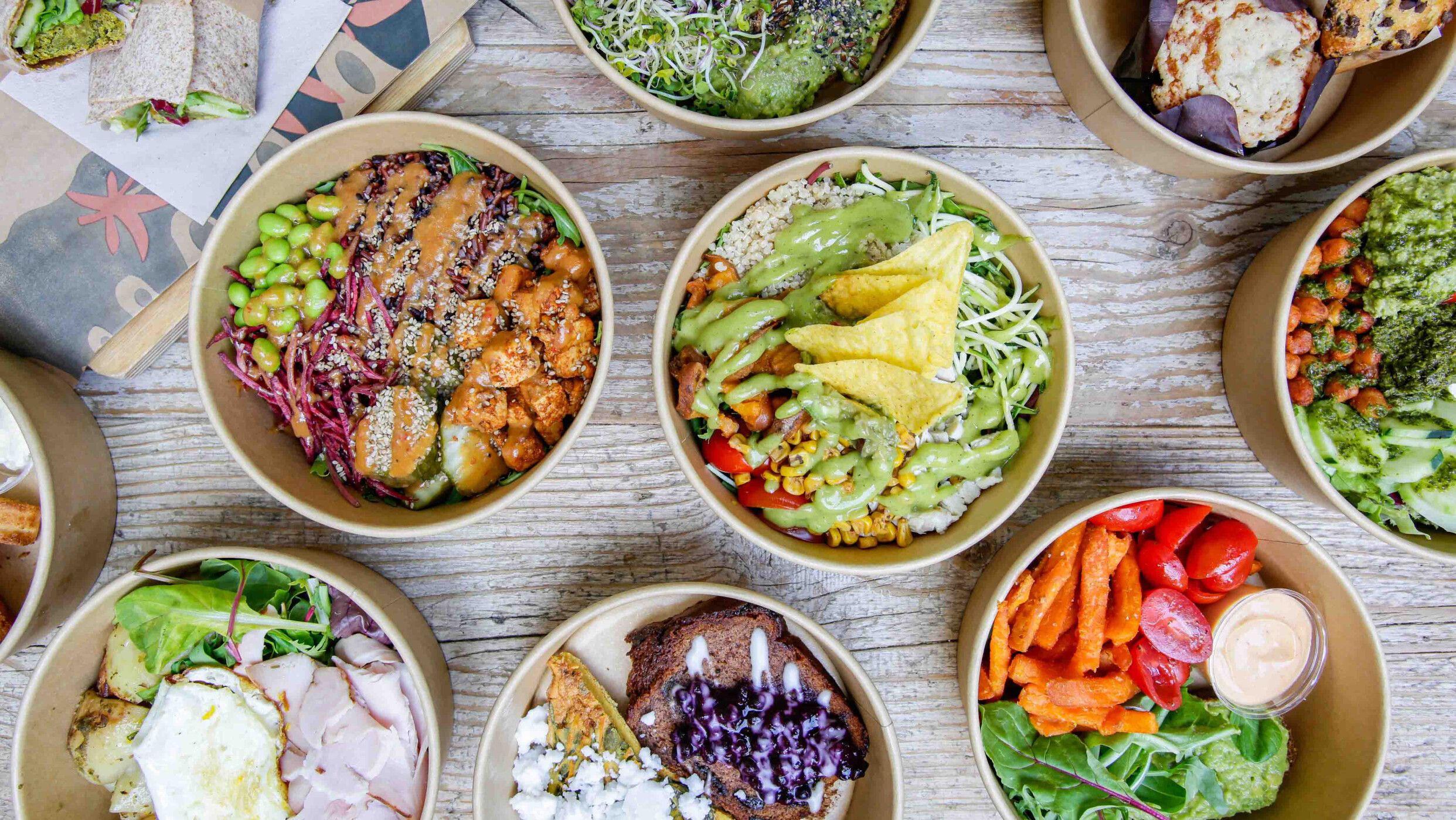 super green mix, quinoa, hummus di stagione, cetrioli e carote crude, za’atar crostini, falafel al forno fatto in casa, dip allo yogurt con pomodori secchi – servito con dressing al prezzemolo, menta, basilico e limone