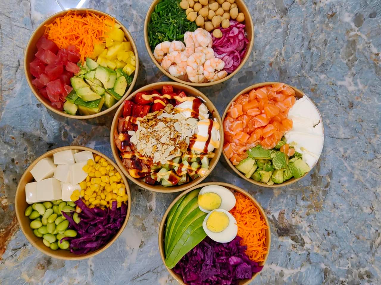 Bowl piccola, riso bianco con salmone crudo-avocado-pomodorini-edamame-cipolla rossa-maionese-salsa di soia-cipolla fritta-semi di sesamo