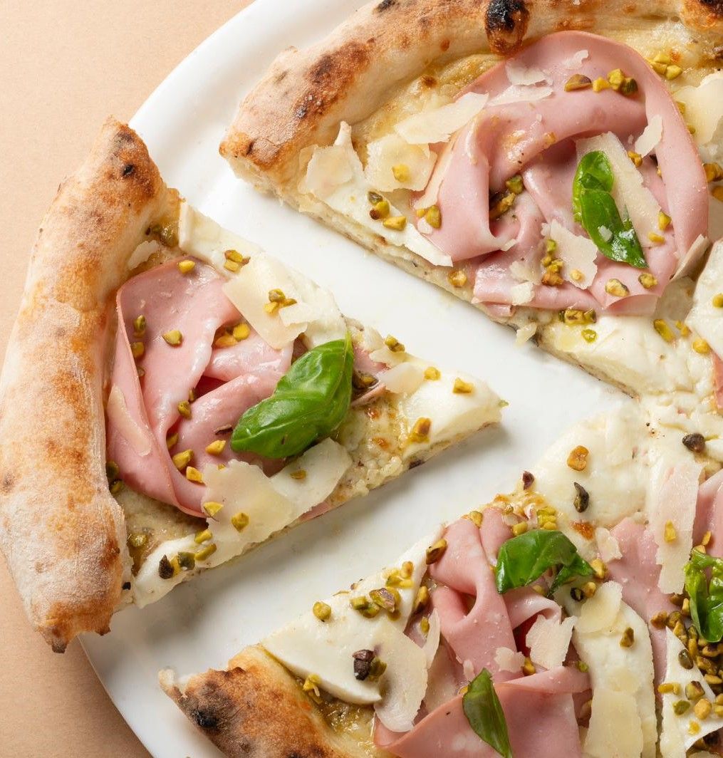 Provola, crema di pistacchio, mortadella, scaglie di parmigiano e granella di pistacchi