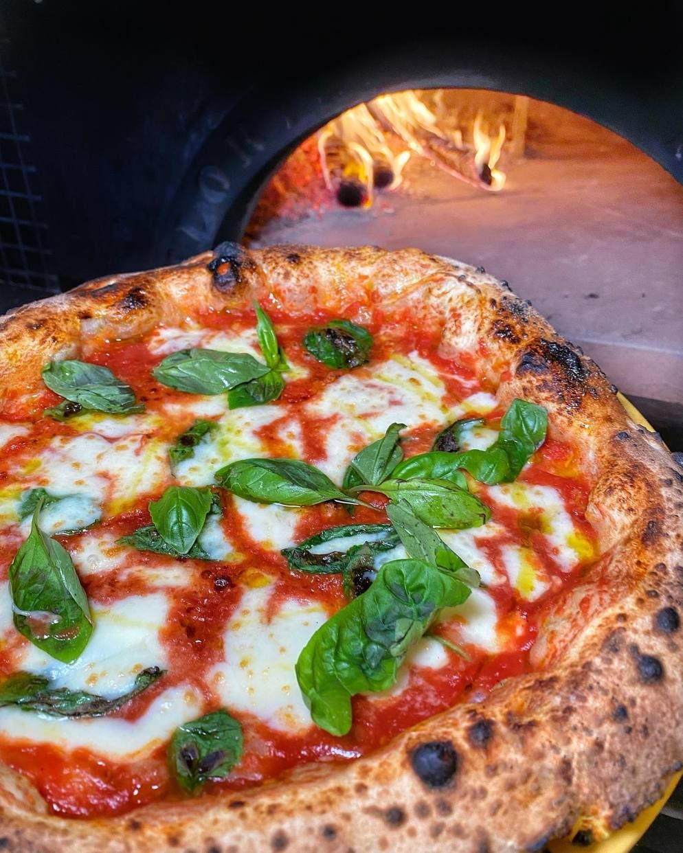 Pomodorini del Piennolo rosso, datterino giallo, pancetta paesana, olive nere, aglio, origano, caciocavallo Irpino, basilico, olio Evo