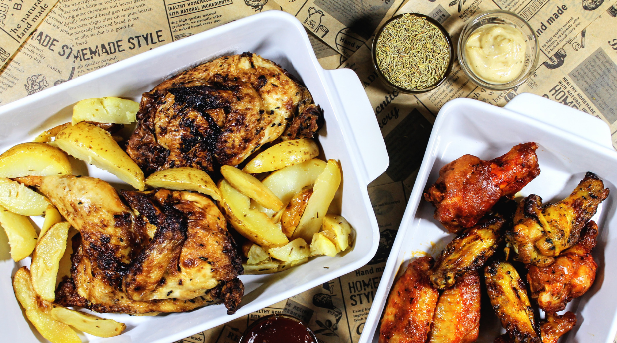 Mezzo polletto cotto su brace di legna, aromatizzato con erbe e una porzione di patatine fritte