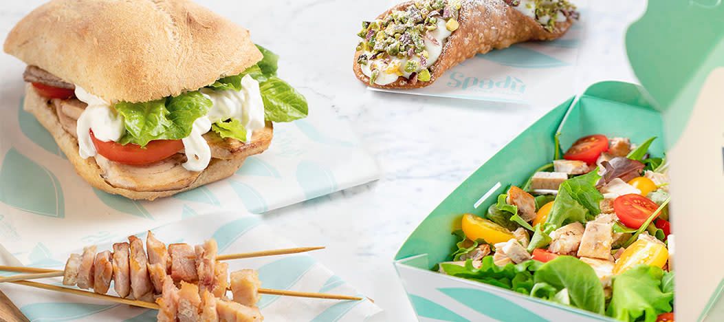 Ciabatta o focaccia semi integrale, trancio di pesce spada, rucola, scaglie di parmigiano D.O.P, pomodorini ciliegino gialli e rossi, crema di yogurt, salmoriglio