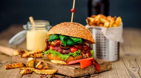 Pane di nostra produzione, Hamburger 100g, Bacon Croccante, Provola Affumicata, Patate Fritte, Anelli di Cipolla Fritti³ e Salsa Burger