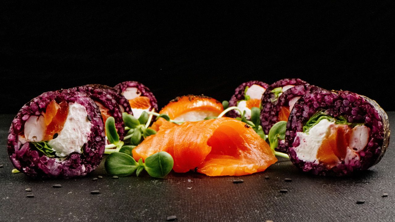 surimi di granchio e philadelphia interno, salmone scottato e salsa teriyaki esterno