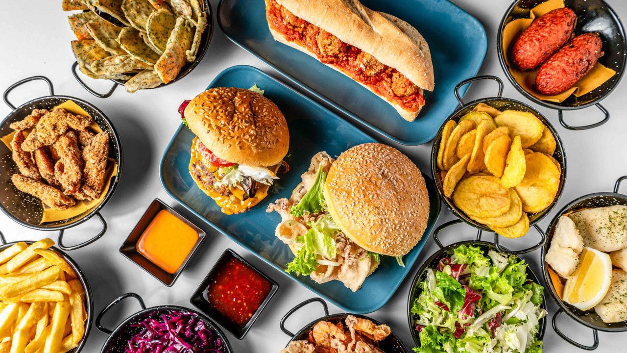 Panino: burger manzo, burger salsiccia, schiacciata di patate, formaggio ceddar, insalata, pomodori e salsa burger Contorno : patatine cips fritte bibita: Molecola