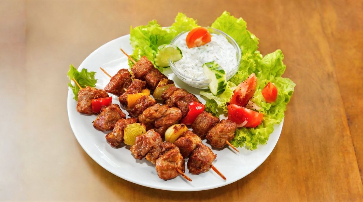 Свежие огурцы, помидоры, болгарский перец, баклажан, говядина, заправка