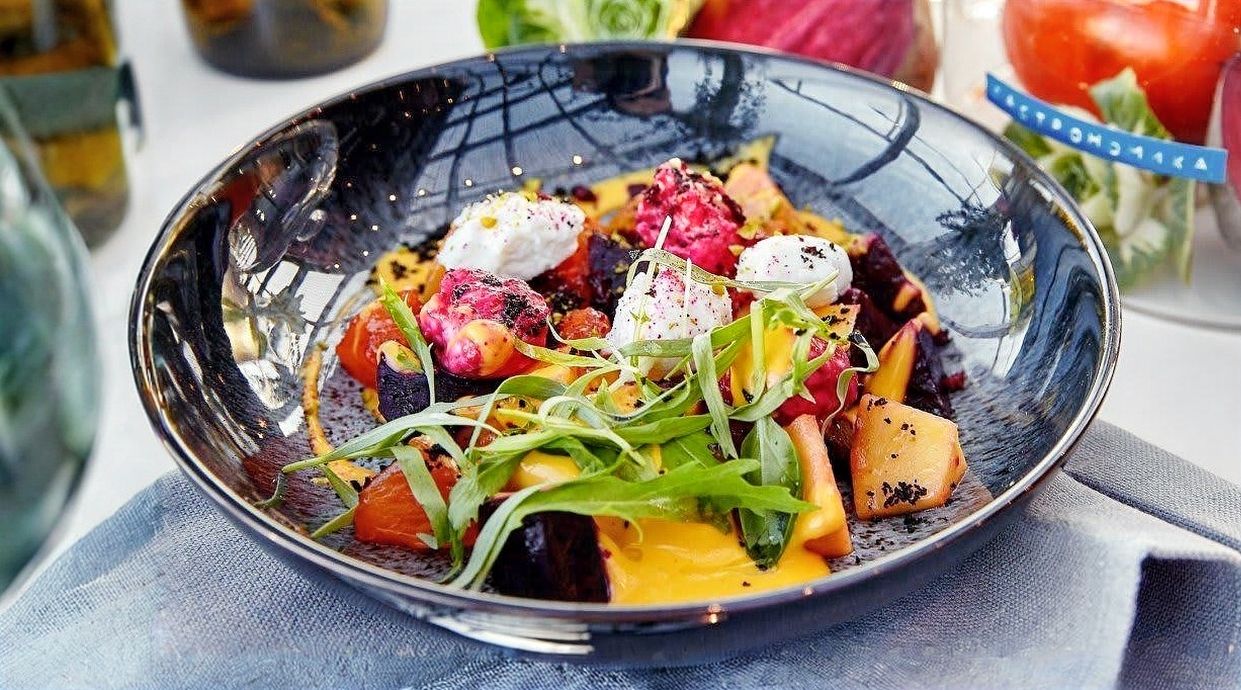 Запеченная свекла, шпинат, руккола, мягкий сыр, гранат, медово-оливковая заправка