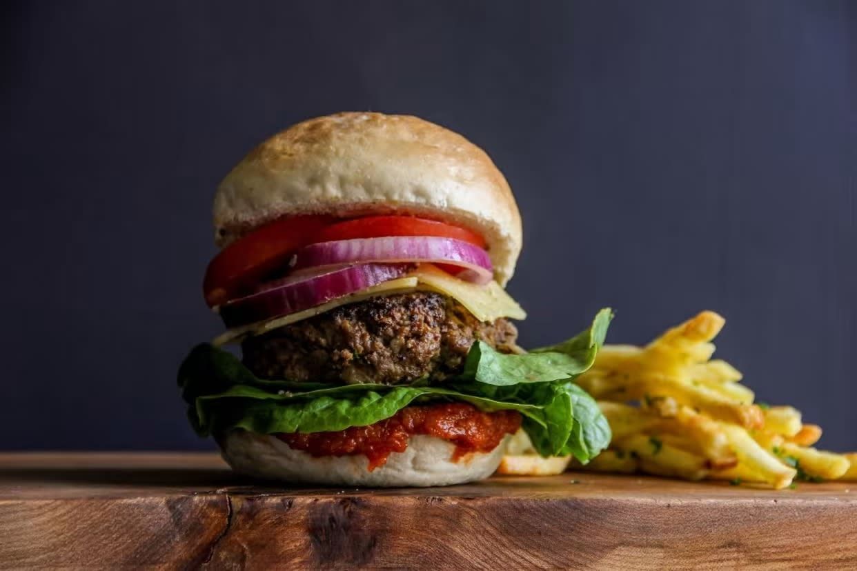 Булочка с кунжутом, говяжья котлета, помидор, лук маринованный, сыр Чеддер, айсберг, фирменный соус