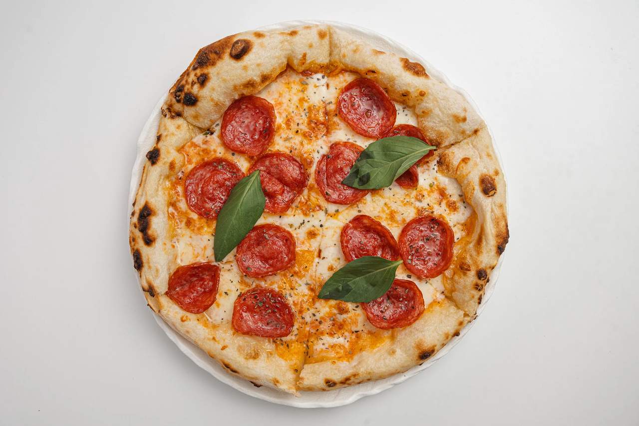 Пицца с томатным соусом, пикантной пепперони и сыром Пармезан.