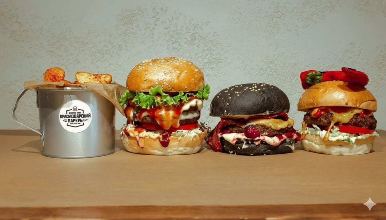 С котлетой из мраморной говядины, с сырами чеддер и моцарелла, беконом из индейки и пряной вишней