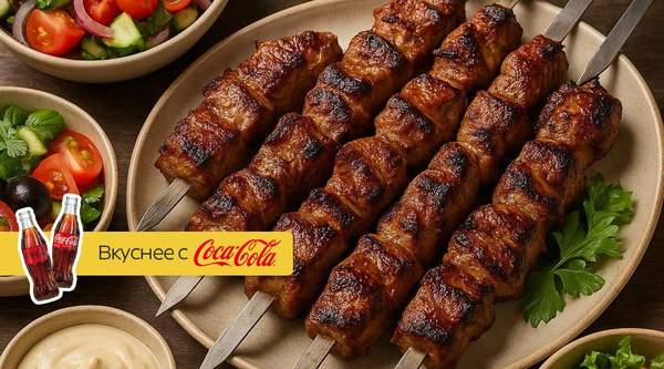 Люля кебаб 10 шт Кавказская нарезка 1 шт Красный соус 2 шт Кола 1 л Лепешка