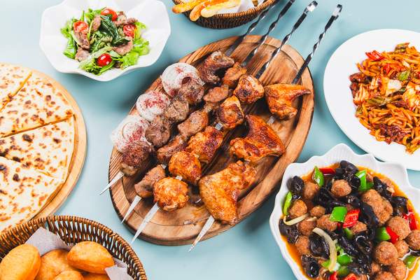 Баранина (2 порция), ребра (1 порция), печень (1 порция), люля-кебаб из баранины (2 порция), крылья(1 порция), окорочка(1 порция), куриное филе(1 порция), овощной(1 порция), шампиньоны(1 порция), утка(1 порция)