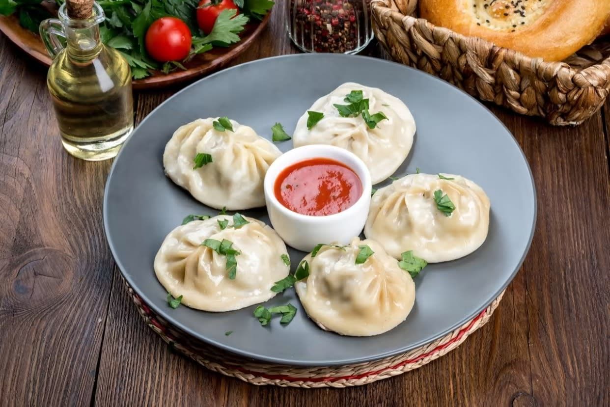 С любовью приготовленное тесто и мякоть говядины рубленная с луком и курдюком и тыквой.Подаем с йогуртово-чесночным соусом и укропом.