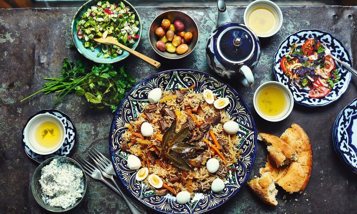 Рис лазер, мякоть говядины, нут, лук, морковь красная, морковь желтая, зира, изюм, соль, вода, баранина курдюк, масло растительное