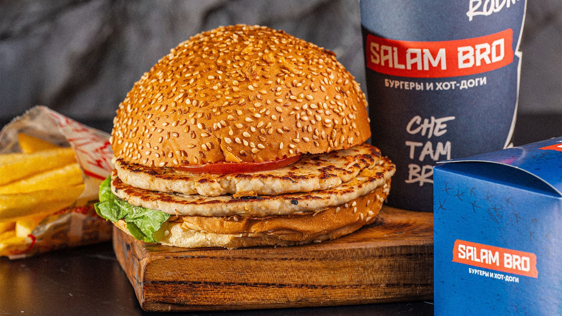 Чизбургер с двойной говяжьей котлетой, лист салата, помидоры, сыр Гауда и фирменный соус Salam Bro