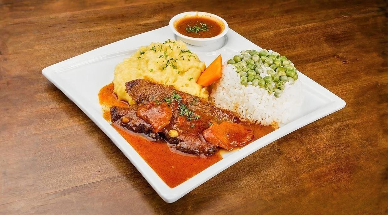 Говядина, овощи, томатный соус, рис.