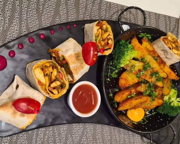 Viande hachée, poivrons marinés à la mexicaine et roulés dans un pain galette.