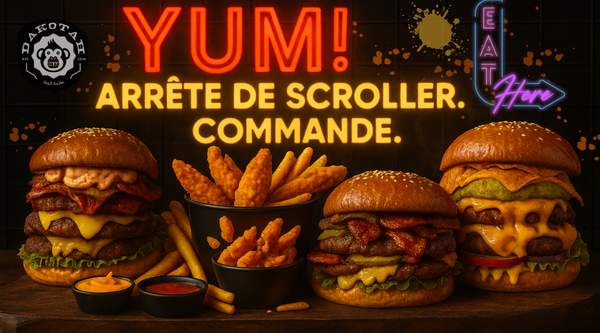 bun brioché, cheddar fondant, viande au choix, tomate, chou, laitue, oignon et sauce moutarde-ketchup. Un vrai classique Dako’tah !