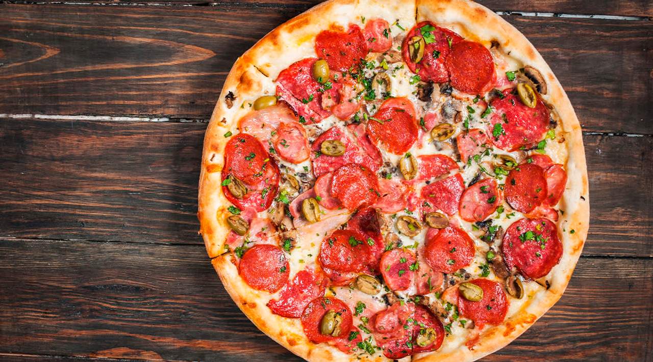 Sos, ser, salami, szynka, pieczarki, papryka pepperoni