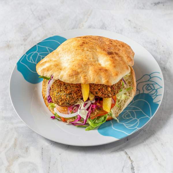 Falafel, sałata lodowa, surówka, ogórek, pomidor, sos (zdjęcie poglądowe)