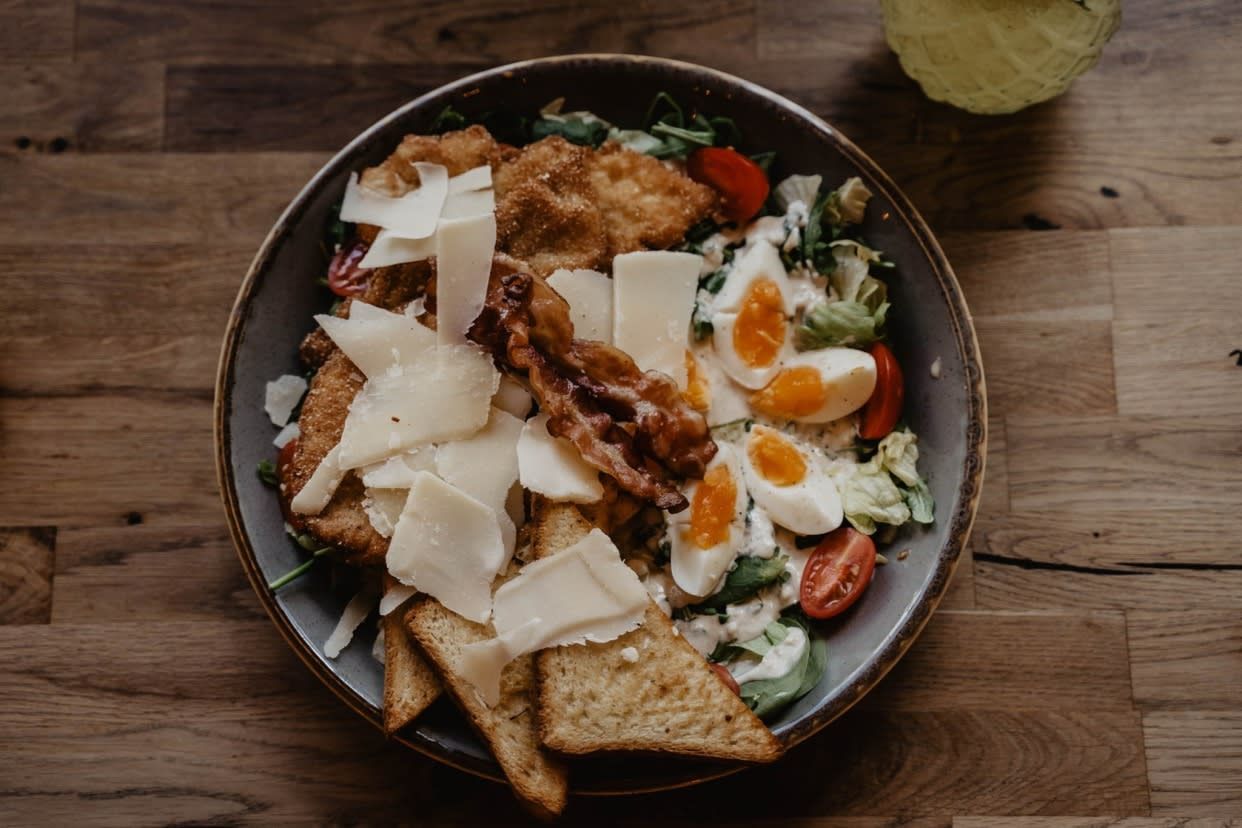 Panierowana pierś z kurczaka, mix sałat, pomidor, jajko na twardo, sos parmezanowy, parmezan, grzanki