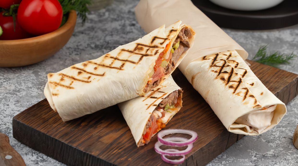 mięso, sałata lodowa, ogórek, pomidor, oliwki, sos