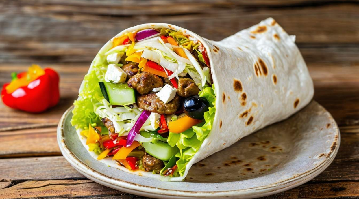 Mięso, sos, sałata lodowa, ogórek, papryka, kapusta pekińska, cebula, ser feta, oliwki, ogórek kiszony