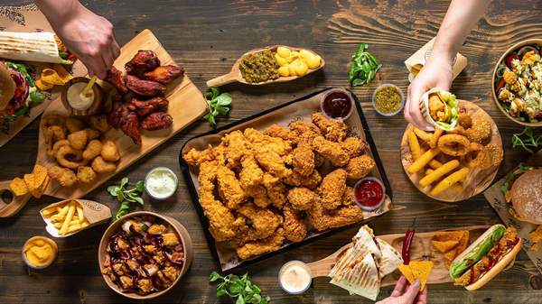 5 skrzydełek, 3 stripsy, dowolny sos.