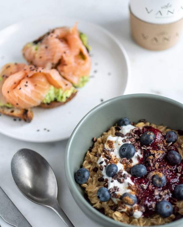 Baza: jagody açai, banan, guarana. Dodatki borówki, banan, granola, masło orzechowe