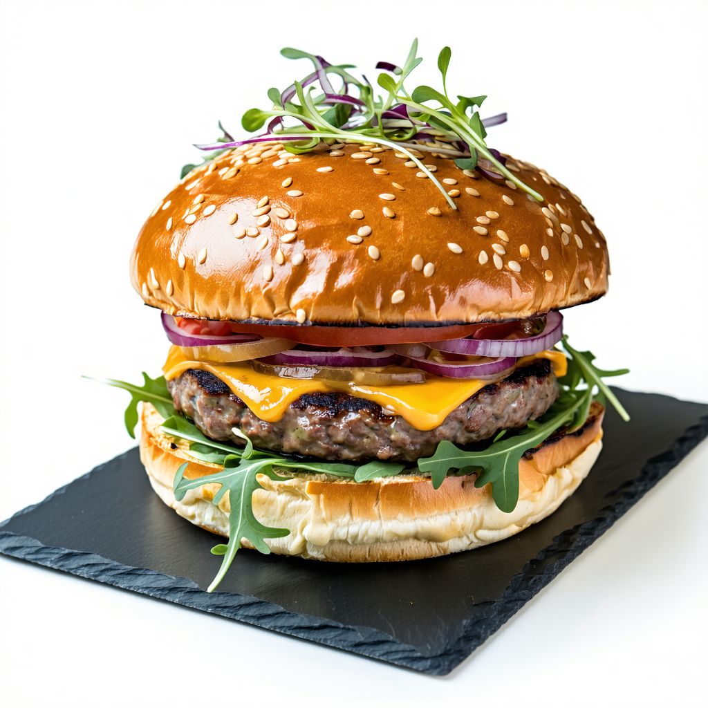 Bułka maślana, wołowina rasy angus, jajko sadzone, bekon, cheddar, sałata, pomidor, pikle, cebula czerwona, sos amerykański, majonez