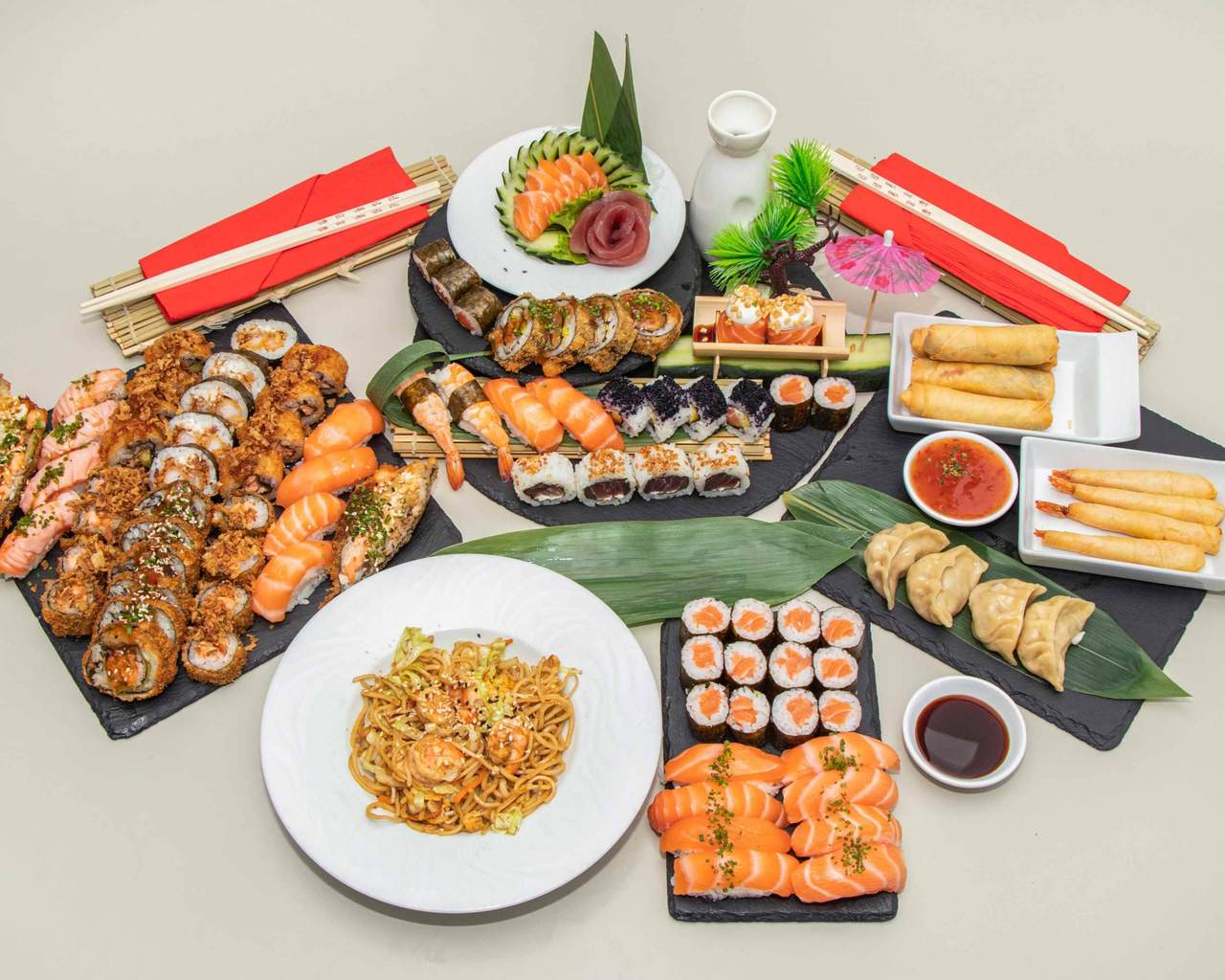 5 sashimi salmão, 5 sashimi salmão braseado, 6 uramaki salmão com cebola frita, 3 uramaki salmão com amendoim, 6 gunkan salmão, 6 hosomaki salmão, 6 rolos sem alga.