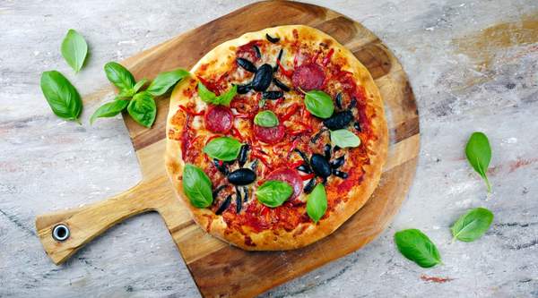 Sos pizza, bacon, salam, șuncă, porumb, ciuperci, ardei, măsline, mozzarella - 600g