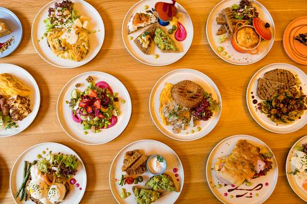 Scrambled eggs gătite cu unt, bacon și cârnat de casă | Roșii cu busuioc | Iaurt cu hrean | Salată proaspătă cu semințe, vinaigrette de fructe de pădure și dressing cu avocado și busuioc | Pâine cu maia și semințe