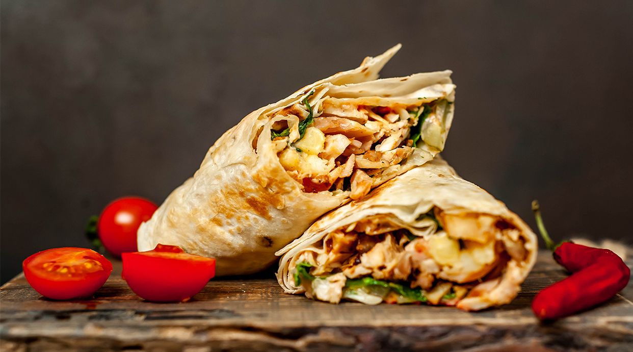 lipie, carne de pui, cartofi prajiti, sosuri, salate