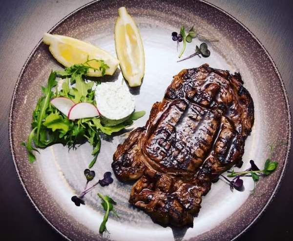 Muschi de vita, cartofi wedges, bacon, rosii cherry, spanac baby, ceapa verde, ou ochi, usturoi - 400g