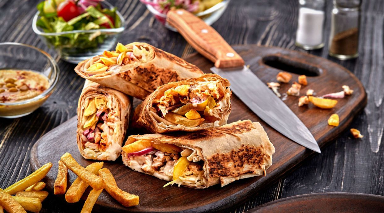 Lipie , carne de pui , cartofi prăjiți , salate , sosuri - 500 g