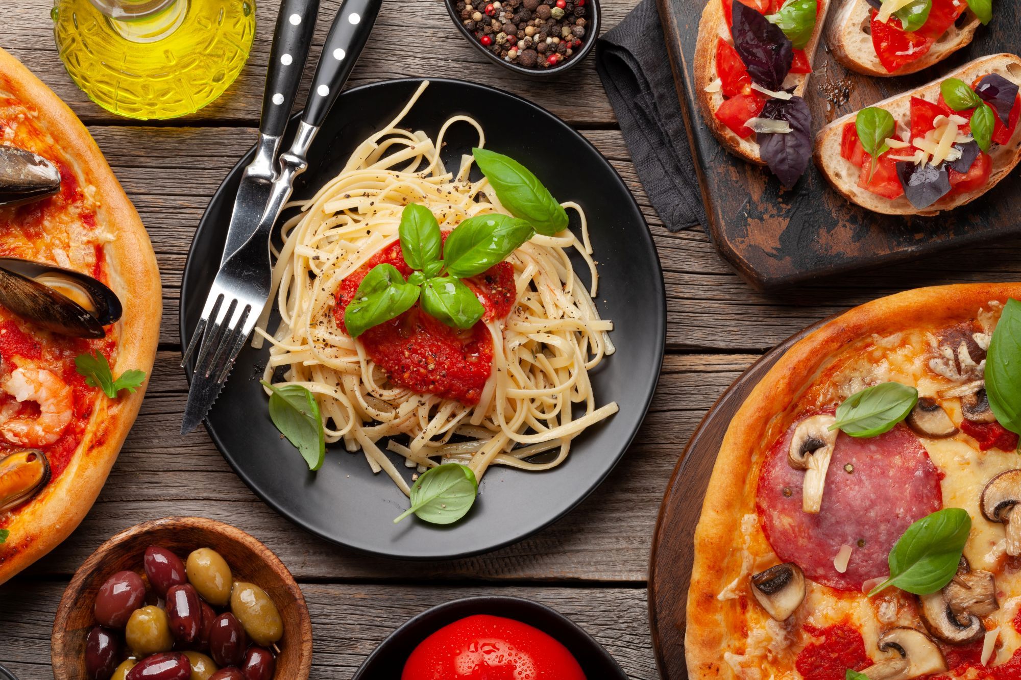 Paste proaspete, sos de roșii aromatizat în casă, usturoi, ardei iute, ulei de măsline